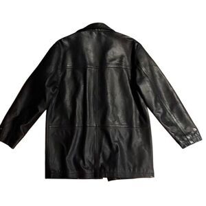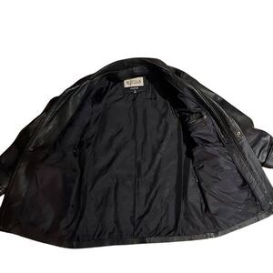 This item is a vintage Wilsons Leather black jacket, pre-owned and in excellent condition. Made from genuine leather, it features a classic design with a snap collar, front zip closure, and two spacious front pockets. The interior is fully lined for added comfort. The tag reads "M. Julian"—we’re not sure who he is, but judging by how well this jacket was kept, he must’ve been a legend in leather care!
