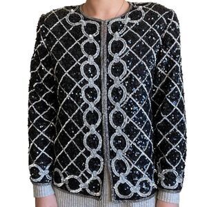 Vintage Womens 80s Silver Black Sequin Sparkly Geometric Silk Embroidered Blouse