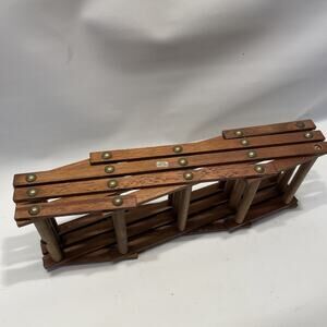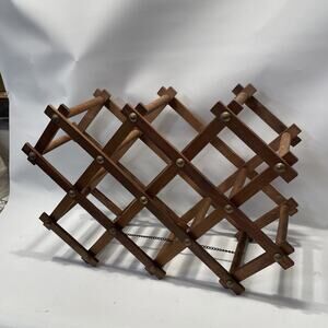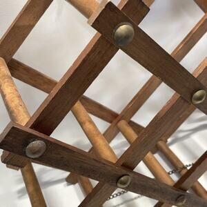 This vintage wood and brass tack expanding wine rack table top holder can accommodate up to 8 bottles of wine. It is made of brown wood and has an abstract shape. The rack is stackable and can be expanded to fit more bottles.