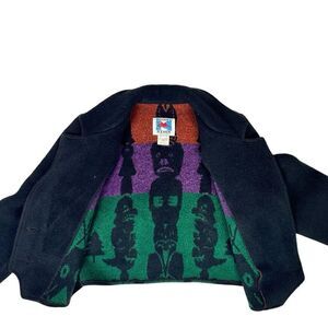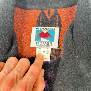 This Vintage Wooded River Jacket is a stylish and unique addition to any woman's wardrobe. Made with wool outer shell material and lined with acrylic, this short-length jacket features a button closure, long sleeves, and a relaxed fit. The multicolor design with a Western, Aztec, and 90s theme adds a trendy touch to any casual outfit. Perfect for the winter, fall, or spring seasons, this jacket also includes a collared neckline and pockets for added convenience. Made in the United States by Wooded River, this vintage piece is sure to stand out from the crowd.