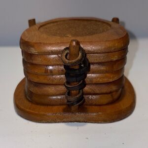 Elegant wooden coaster set with a matching holder. Perfect for protecting surfaces.