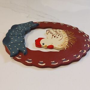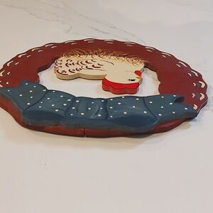 Vintage Wooden Hand Painted Chicken Wreath with a blue dotted bow. Fun country style with a roosting chicken. 1980's -1990's era.
