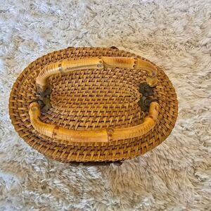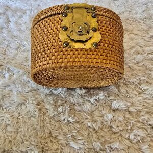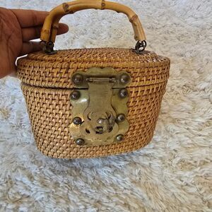 Vintage Woven Tan Basket Handbag With Metal Attachments