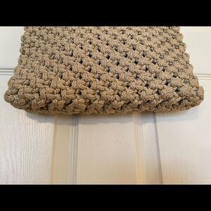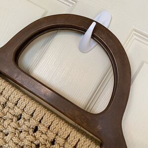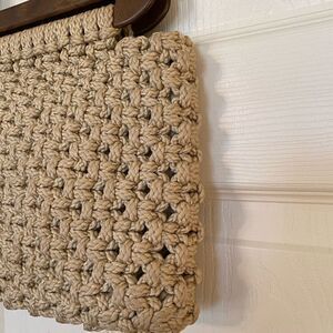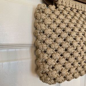 Vintage woven knitted macrame handbag crochet In great condition feels homemade No brand tag see photos for measurements Medium wood stained colored handle Inside is lined and in great condition Perfect for summer Cream color knitted material