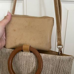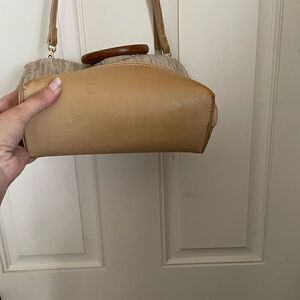 A cute vintage brown woven hand bag with a wooden handle!