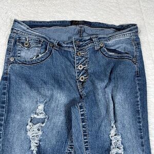 Vintage Y2K Angels Distressed Bootcut Button Fly Women’s Jeans in gently used condition. Size women’s 14. Waist 16 1/2”, rise 8 1/2”, inseam 30 1/4”, leg opening 9”. 💥 2000s Baddie / Rock Revival Babe