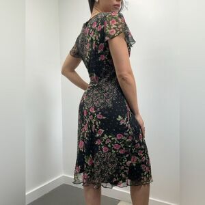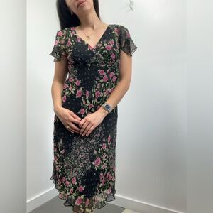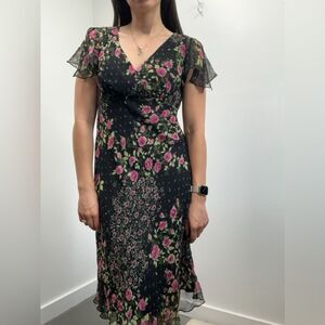 Vintage Y2K Black & Pink Ruffle Flutter Sleeve V-neck Midi Dress Size 8
