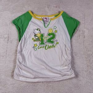 Vintage Y2K Hello Kitty Sanrio Cheerleader Baby T Tee Shirt in gently used condition. Size youth large, women’s XXS. Pit to pit 13 1/2”, total length 16”. 💚 Y2K Kawaii Sporty / Cheerleader Cute