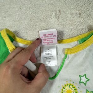 This Hello Kitty “Camp Cheer!” shirt is pure early-2000s tween energy — bright colors, raglan sleeves, and bubbly cheer-themed graphics. The green and yellow palette with star accents gives it a fresh, sporty vibe, while the Sanrio character adds that irresistibly cute, slightly kitschy charm. It’s the kind of top you’d wear with low-rise jeans, jelly bracelets, and glitter lip gloss for a day at the mall or a summer camp hangout.