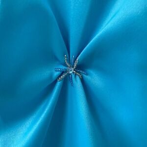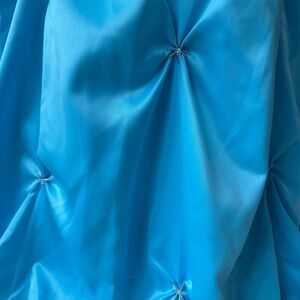 Y2K masquerade turquoise blue halter neck open back formal gown with beadwork at the bust line, and a unique beaded tufting detail at the full A-line skirt. The top hooks behind the neck and mid back before zipping at the skirt. The polyester fabric is satin. The hooks are adjustable at the back of the neck. The hook loops at the mid back tabs have been removed however they hook easily into the threads left behind. You could move the extra hooks behind the neck if you wanted to, but it’s not necessary. Lightly padded cups reduce the need for a bra. Laying flat measures 18 inches armpit to armpit, 14 inches straight across the waist and 56 inches shoulder to hem. The beadwork, rhinestones and sequins are all silver or turquoise