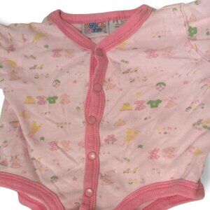pastel pink, cartoon print, snap buttons, baby romper, youthful style, playful, soft cotton, adorable, children’s apparel, retro
