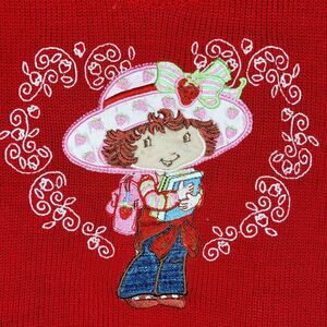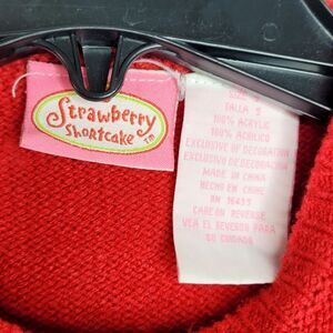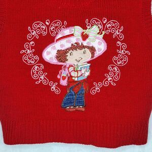 Adorable red knit vest featuring Strawberry Shortcake embroidery. Perfect for adding a playful touch to any outfit.