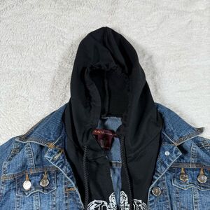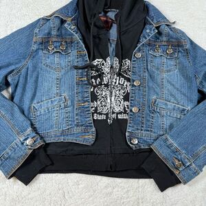 Vintage Y2K Weeso Hoodie & Denim Layered Grunge Emo Jacket in gently used condition. Size women’s XL. Pit to pit 21 1/2”, total length 16 1/2”. 💀 2000s Biker Babe / Ed Hardy Street Glam