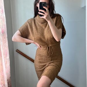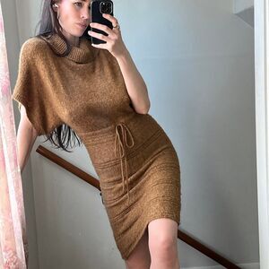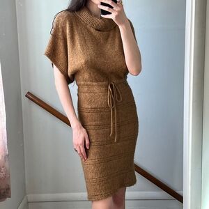Tags, cowl neck, chic, minimalist, camel, brown tan, natural life, tomato girl knit sweater dress office siren