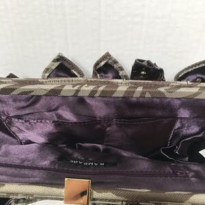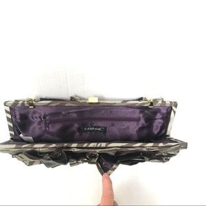 Comes with optional detachable gold medal chain strap, features brown & beige ruffled material accents with brown faux leather accents, purple satin interior liner approximately 13 x 6 x 2 with a 12 inch drop