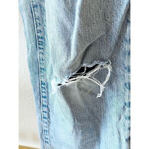 90’s vibes with a grunge streak. Distressed jeans with two front pockets and two back pockets. Belt loops. Ripped at the knee with other distressed sections. In excellent condition.
