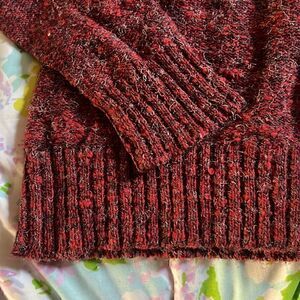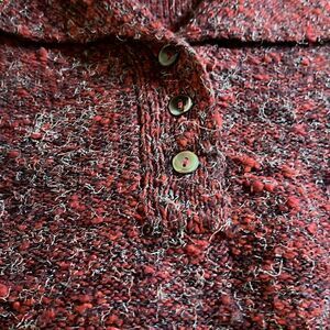 Kind of a wool boucle fabric. Very unique double, notched collar with three button front sweater. Excellent condition. Measurements in photos.