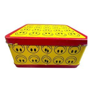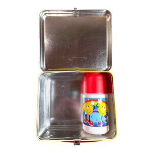 This durable metal lunchbox features a classic smiley face design, vibrant yellow and red colors, and includes a matching thermos for added convenience.
