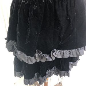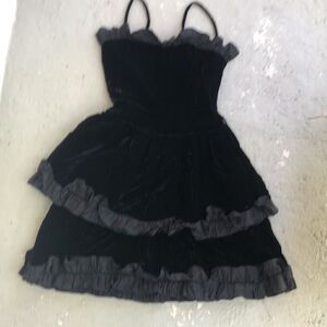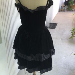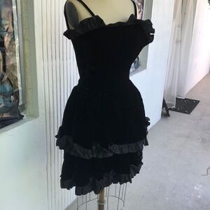 This is a velvet Saint Laurent vintage dress. It is beautiful. Needs to go to the cleaners and have the ruffles steamed out. Measuring is 16 inches to the waist area is 13 inches to the bottom of your ruffle is 31 inches. Measurements are approximate. Needs a couple of stitches through the zipper. Inside label says EU 40 but I have included measurements because it is smaller than that. Made in France. It’s a stunning, velvet and taffeta dress