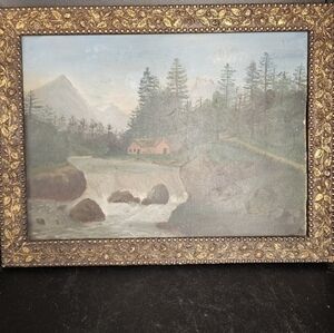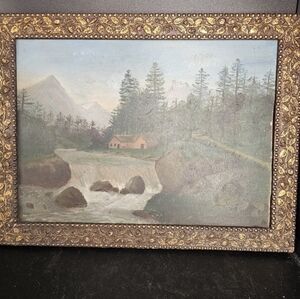 here is a vintage landscape oil painting likely from way up north. this is an oil painting on board. I'm sure the frame has some value also, the painting and the board are in very good vintage condition.