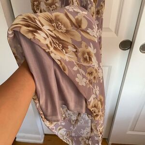 Descriptions: vintage bias cut maxi dress, short flap sleeve, lined, has some stretch, lilac with cut floral print, very flattering