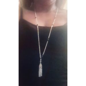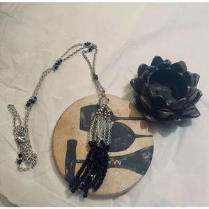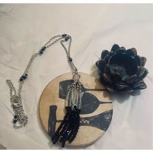 This cute vintage tassel necklace is black and white and made to sparkle like bling in the light. Very eye-catching piece that dresses up any outfit. NWT #tasselnecklace, #whitetasselnecklace, #blacktasselnecklace, #bohonecklace, #bohojewelry