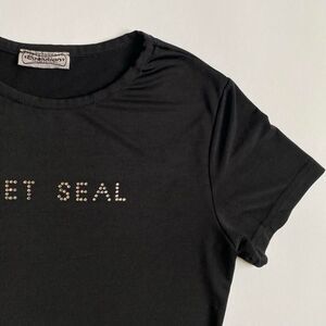 Fit & features: Fits like a S/M depending on desired fit. Bedazzled w/“Wet Seal” on the front, cap sleeves & a slinky fit. Shown on a size L/38b/5’5