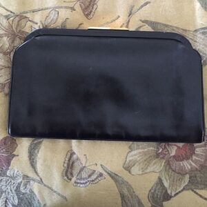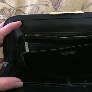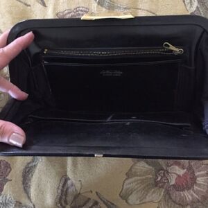 This black leather inside and out bag was made in Buenos Aires, outside is good, inside is clean but has a zippered pocket n a slit pocket that needs restitching or gluing. 11x7 hardware has tiny scratching from use