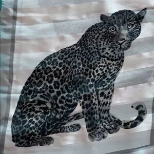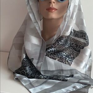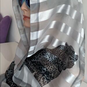 This is a beautiful chiffon and striped polyester silky scarf with a print of cheetah on each side. Perfect condition. Drapes beautifully.