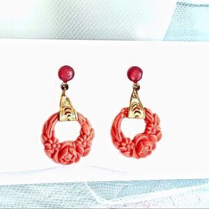 Absolutely beautiful pair of coral colored pressed glass with a floral design, these are suspended by golden filagree hanging from a tiny enameled top. These are really the prettiest pair of pressed glass earrings that I have had. They look like real coral. Measures approximately 1.5” in length and .75” wide. Excellent condition. Please see all photos for full description.