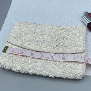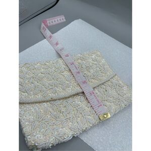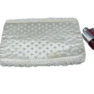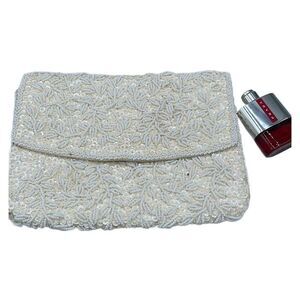 Vintage cream satin beaded clutch. Snap front. White seed pearls and sequins. Satin interior. Marks on exterior and interior are shown in pictures.
