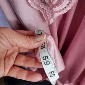 rose satin and lace vintage formal.  zippered back.  pit to pit 16" waist 14.5" length 59".  tag has been roved, so no manufacturer or size, please refer to measurements.  there is one tiny hole near the back seam on the skirt and a couple very small snags, see pictures