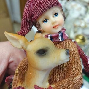 Adorable Winter Children Christmas figurine with a girl hugging a deer in the snow. Beautiful details.