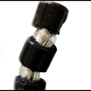 Colorful glass bead necklace made of hand blown tubular glass beads 5mm long, the beads are in black, bright red, yellow and green. Each bead is separated by a smaller clear glass bead which allows the larger bead to articulate and form interesting scallops when you wear it, the colors are bright and intense, the black deep. Each bead has slightly different coloration. No flaws found. Really unique and fun necklace, great for layering,,spring clasp. Please see all photos for full description. 22” long