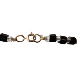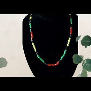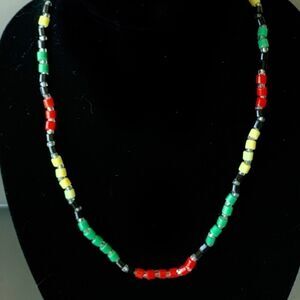 Vintage hand blown glass bead red-green-yellow-black clear necklace 22”L