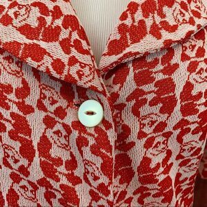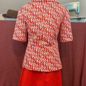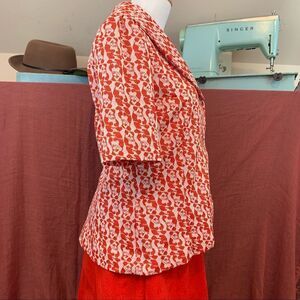 Beautifully handmade 70’s short sleeve blazer style jacket with high waist circle skirt. Adorable pandas on the top fabric and a subtle bird print on skirt. This outfit is in great condition. Three Oversized buttons on jacket, Peter Pan collar. Skirt has back button and zip closure. Skirt is a slightly smaller size than jacket. Please see photos for measurements. Mannequin is size 4 for reference.