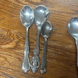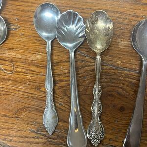 Collection of vintage jams and jelly spoons. There are nine in the lot. Some of the names are WM Rogers, community, Italy, international, Hampton, stainless steel, Japan,