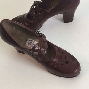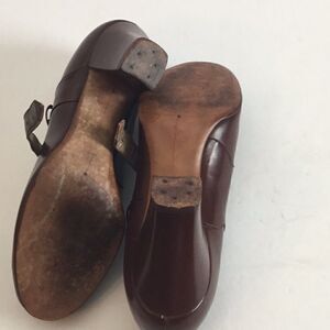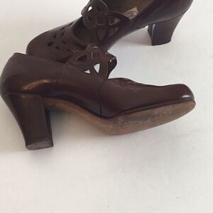 Vintage shoes, not leather, in good condition. Front top straps, brown color. Heel height 2 1/2” measured from back of shoe. Made by DICKERSON I size ladies 4 1/2 B.