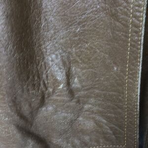 This is a great vintage leather trench, please look at the pictures couple of areas just needs to be recondition. All the leather buttons need to be re-stitched, Seem at the arm hole has come undone so that also needs to be re-stitched. Inside says size 50 I’m a size 4/6 and I put this as a size 6. Measures across the shoulders 16, is 19 through the waist is 17, measuring from the bottom of the collar to the bottom is 31.5. Color is a dark tan/light brown