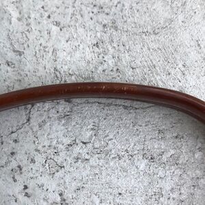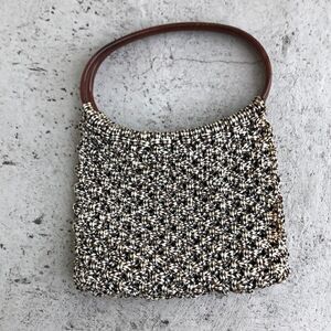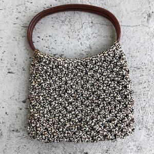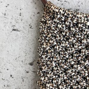 This is a nice vintage macramé bag that has Bakelite handles. I show in the pictures were some of the dark brown has bled into the ivory. I believe the handle is big light and has a few scratches on it. Measures approximately 11 x 8 1/2 x 2 1/2.
