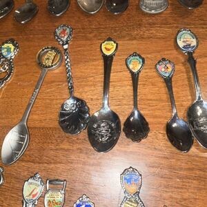 Lot of mostly souvenir spoons from US. A couple from Europe. 3 broken spoons and one silver plated Oneida Community Spoon