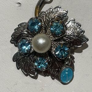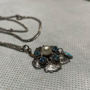 Silvertone with blue rhinestones. Unsigned. Chain is 18” and pendant is 1 1/4”