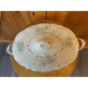 Vintage oval dish footed handles lead floral etched with gold trim, crazing has small chips from handles and out of the handle on the lid few discoloration underneath glaze see pictures 11.5x7” (8726)