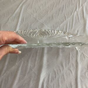 This beautiful footed serving platter is 14“ x 10 1/2“. At its tallest point it stands 1 1/2”. It’s curves and elegance adds so much elegance to your dinner table! Would make a beautiful charcuterie platter too! No chips or cracks.