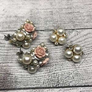 Silver tone faux pearl and flower cluster statement earrings, do have some weight to them. Tiny bit of glue showing in small spot from age otherwise in good vintage condition.