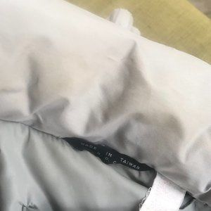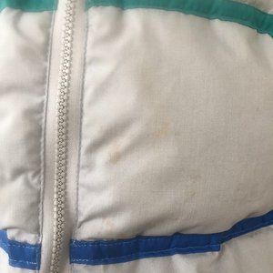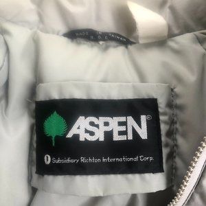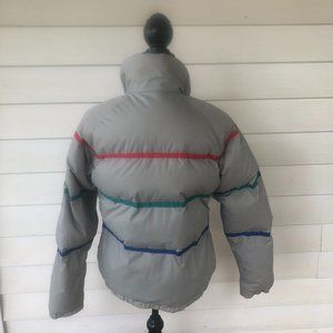 Light gray down puffer jacket with red, green and blue trim. Aspen Subsidiary Richton International Corp, made in Taiwan ROC. Circa late 1970's - early 1980's.