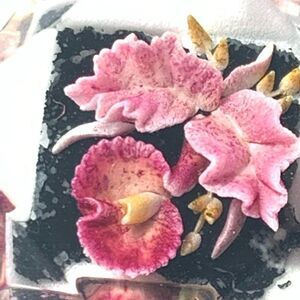 So pretty and striking detailed reverse carved orchid on a black background. The tiny details are amazing. I have matching earrings and and a pin in other listings. This measures approximately 1” x 1”. Please see all photos for full description.