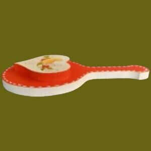 Hand painted Pennsylvania Dutch style wall hanging in the shape of a trivet painted a poppy red with white accents and a white cut wood heart featuring a sleepy baby chicken in greenery with a couple of poppy red flowers. Measures about 13" long and has a hole for hanging at the top. Good condition except for a couple of scuff marks.