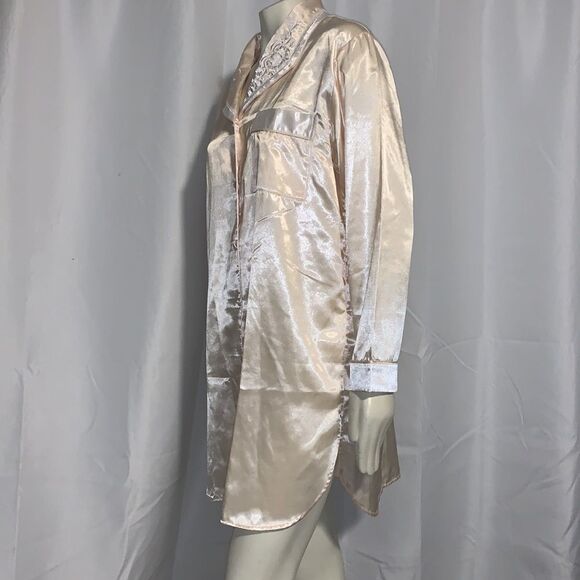 Vintage satin Delicates buttercream yellow button-down fleece lined nightgown. Embroidered lace collar thick satin. Size medium.