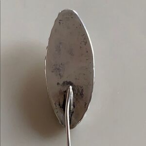 In lovely condition. Looks to be made of inlaid mother of pearl and silver. Beautiful braid work around the oval. Measures 3” long.